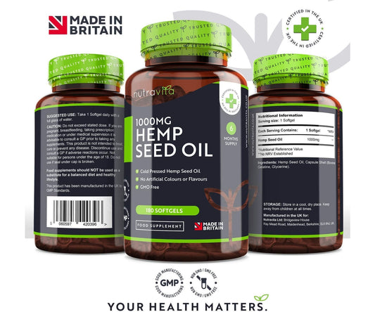 Hanf Kerne Cannabis Sativa - Rein Kaltgepresstes Öl 180 Softgel Kapseln 1000 MG
